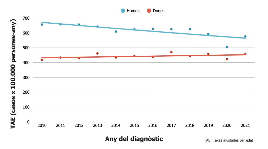 - Globalment, presenta una taxa d’incidència ajustada per edat (casos nous) de 186,5 casos per 100.000 persones-any.